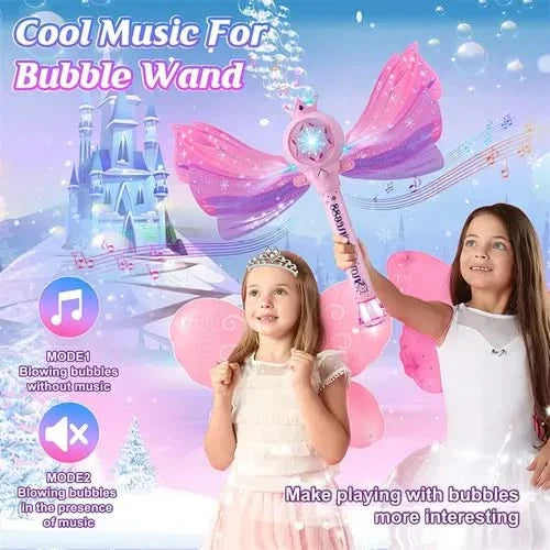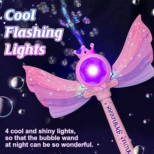 Luces y música fantásticas: la diversión de ser princesa va mucho más allá. La máquina de burbujas con forma de varita de hadas también está equipada con luces parpadeantes y música que puede emitir un sonido, lo que añade más diversión a la máquina de burbujas.